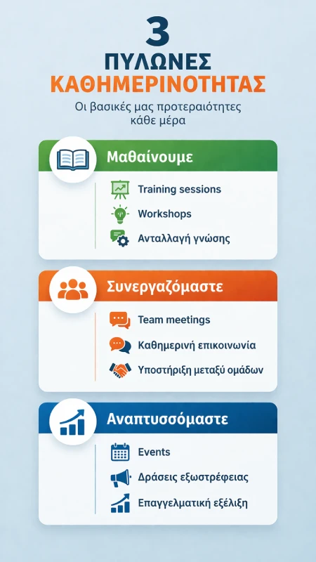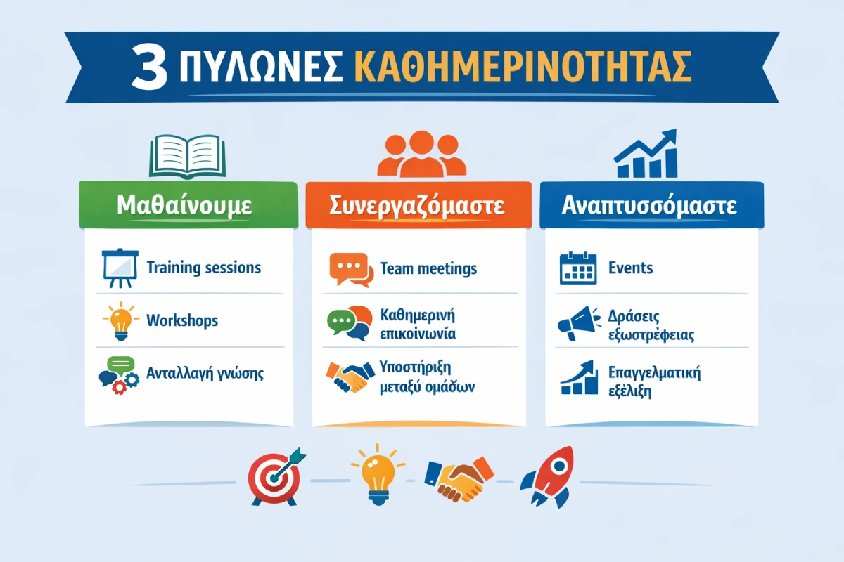 Αυτό που ξεχωρίζει την ομάδα είναι ότι συνδυάζει τη δομή και τη σοβαρότητα ενός οργανωμένου επαγγελματικού πλαισίου με έναν ανθρώπινο, άμεσο και τοπικό χαρακτήρα. Έτσι, δημιουργείται ένα περιβάλλον στο οποίο η απόδοση συνδέεται με τις σχέσεις, τη συνέπεια και την κοινή πορεία εξέλιξης.